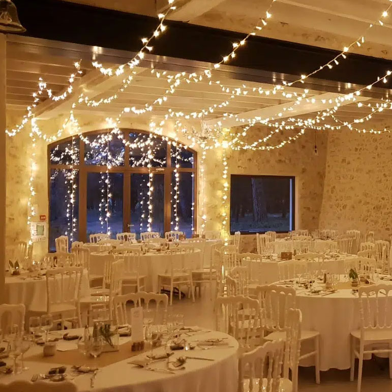 Pour structurer vos lieux de réception, deux configurations vous sont proposées afin de s’adapter à l’architecture de votre domaine. Les guirlandes en V (triangles) apportent un charme guinguette authentique, idéal pour souligner une cour ou un préau. Pour un effet plus immersif, le plafond lumineux (rideaux) crée un véritable ciel étoilé, offrant une lumière dense et féerique au-dessus de vos convives.